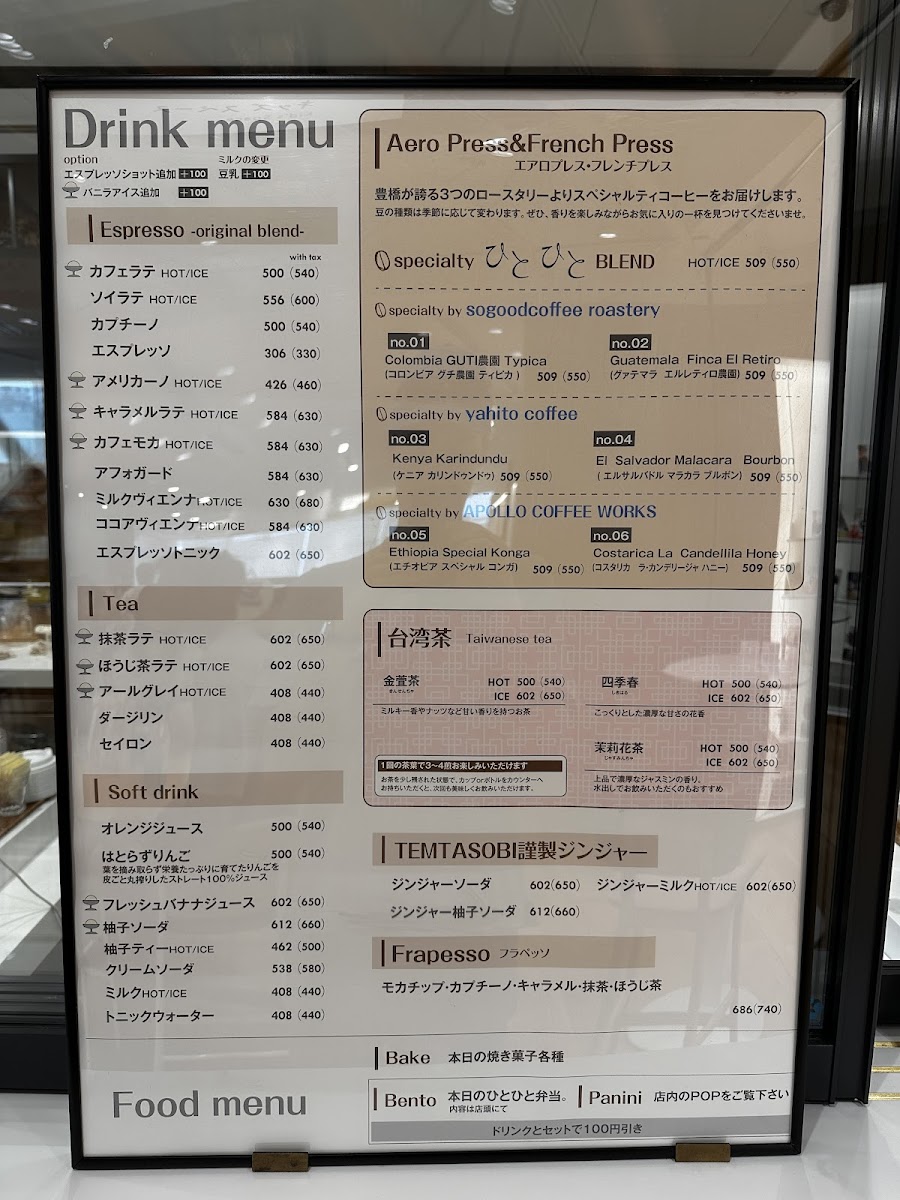 As you enter Hitohito CAFE, the intoxicating aroma of freshly brewed coffee envelops you, instantly uplifting your spirits. The menu here is carefully curated, offering a range of specialty coffee options that will delight any coffee enthusiast. Choose from their expertly brewed Aero Press or French Press selections featuring the standout ひとひとブレンド (Hitohito Blend) available both HOT and ICE for just JP¥600, or indulge in the rich flavors of their specialty beans from renowned roasters like sogoodcoffee and yahito coffee. Highlights include the No.1 Guatemala Finca Las Nubes, No.3 Kenya Karindundu, and No.4 El Salvador Malacara Bourdon, all crafted to perfection for a unique tasting experience.